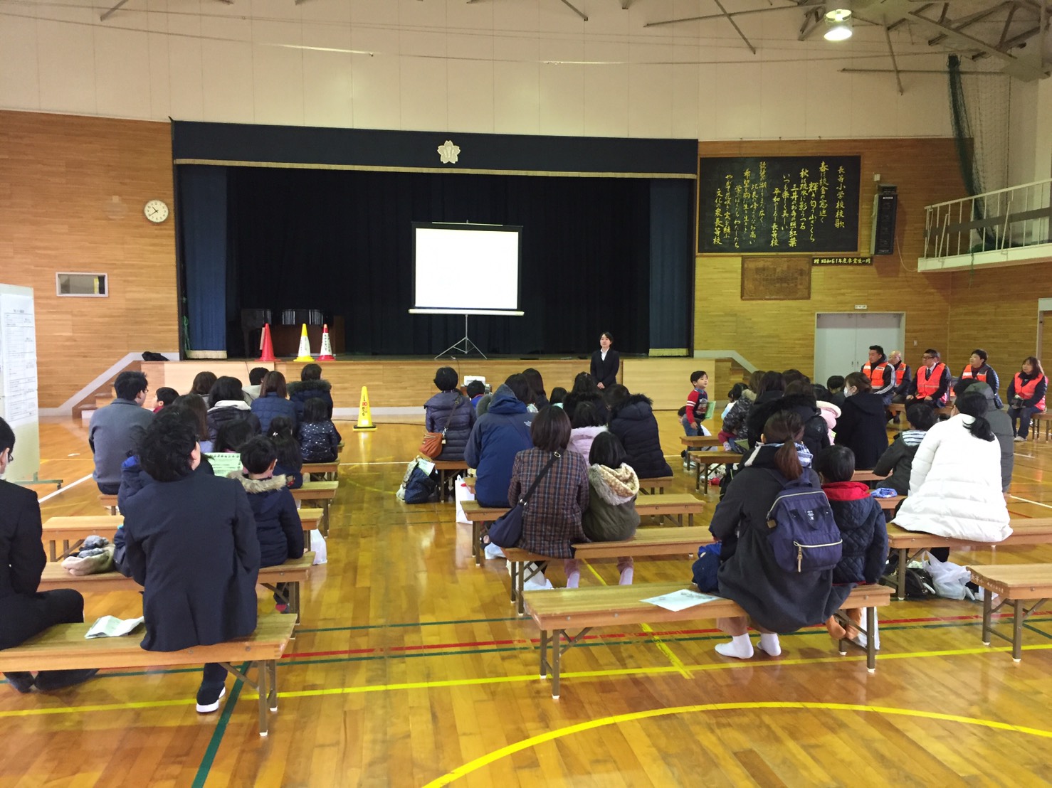 場所:長等小学校体育館 2019年度長等小学校1年生及び保護者を対象に実施しました。22名の新一年生がおうちの方と元気に参加してくれました。登下校ルート説明を聞き、ビデオやクイズで登下校での交通注意点や防犯の注意点(○×…